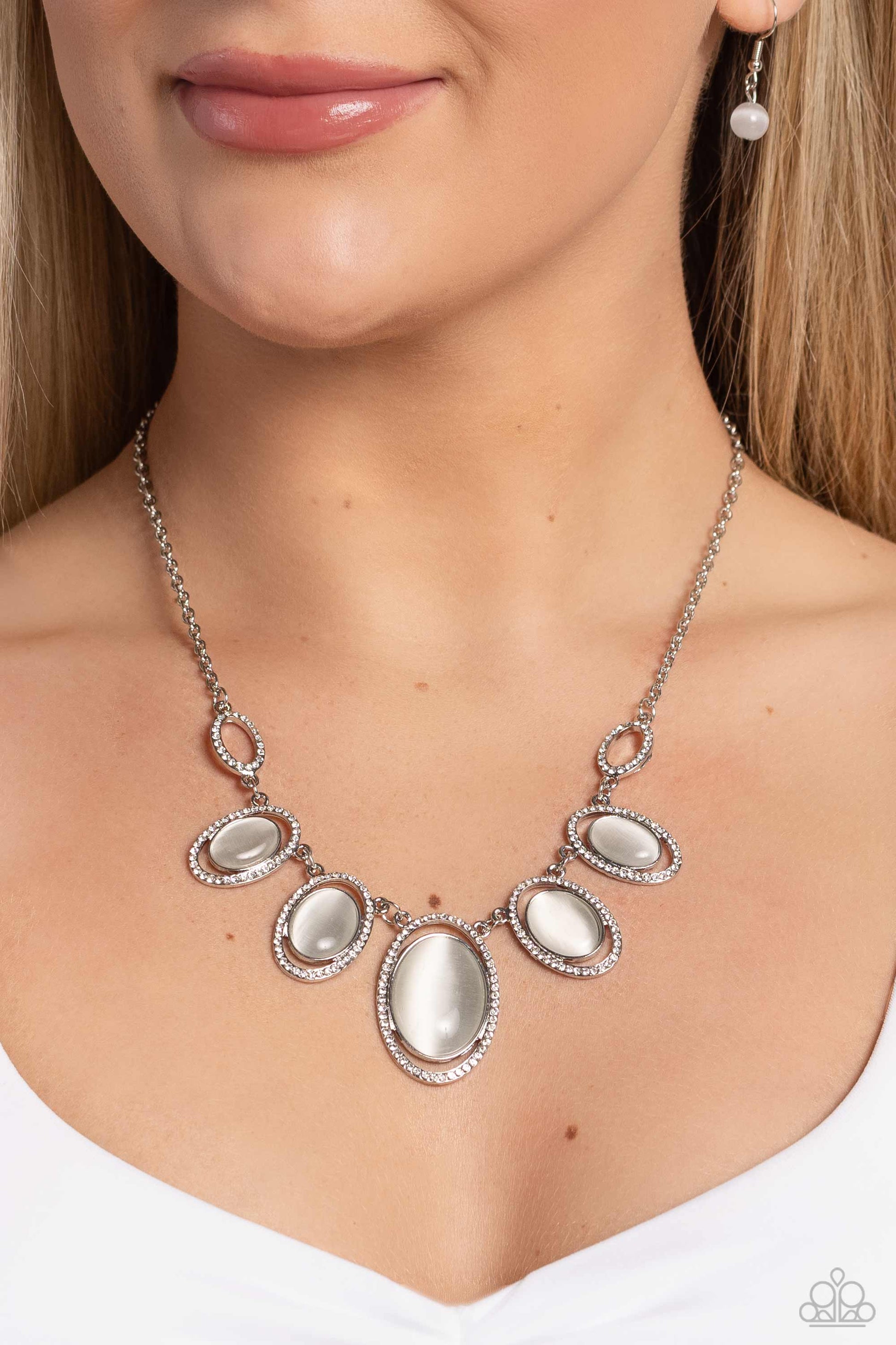 Featuring white rhinestone encrusted oval frames, a mesmerizing collection of glowing white cat's eye stones delicately link below the collar for an ethereal pop of color. Features an adjustable clasp closure.