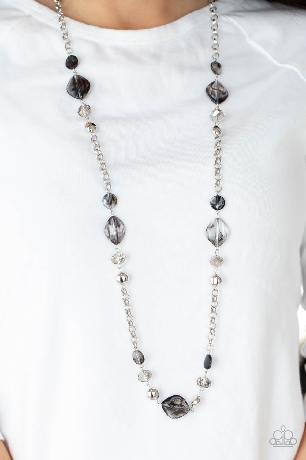 A shimmery collection of smoky glassy-like beads, faceted metallic-flecked crystal-like beads and flat silver beads connect along sections of silver chains, creating a whimsical display across the chest. Features an adjustable clasp closure.